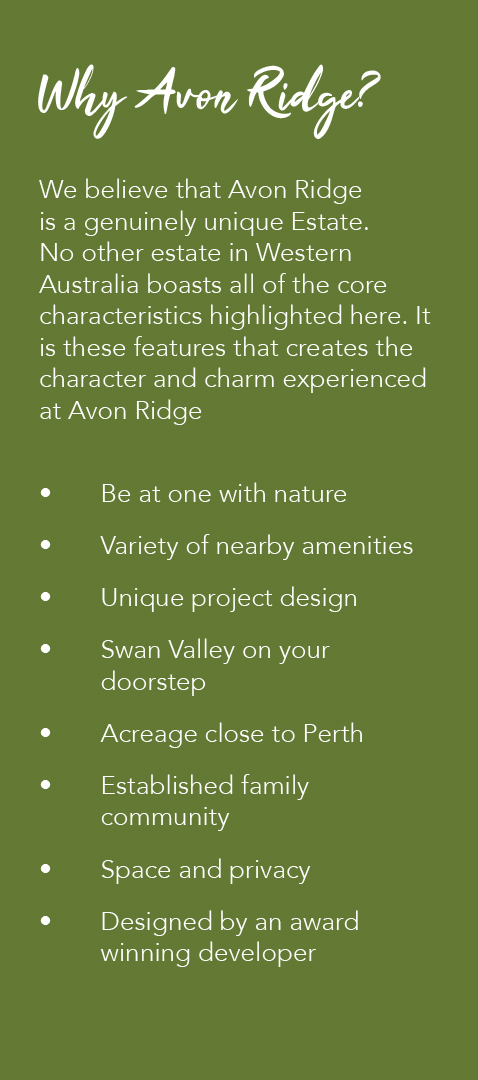 We have highlighted what we believe makes Avon Ridge unique. All these qualities together contribute to making life at Avon Ridge different to any other private estate in Western Australia. Take a look at just some of the reasons why Avon Ridge should be your next move or investment.